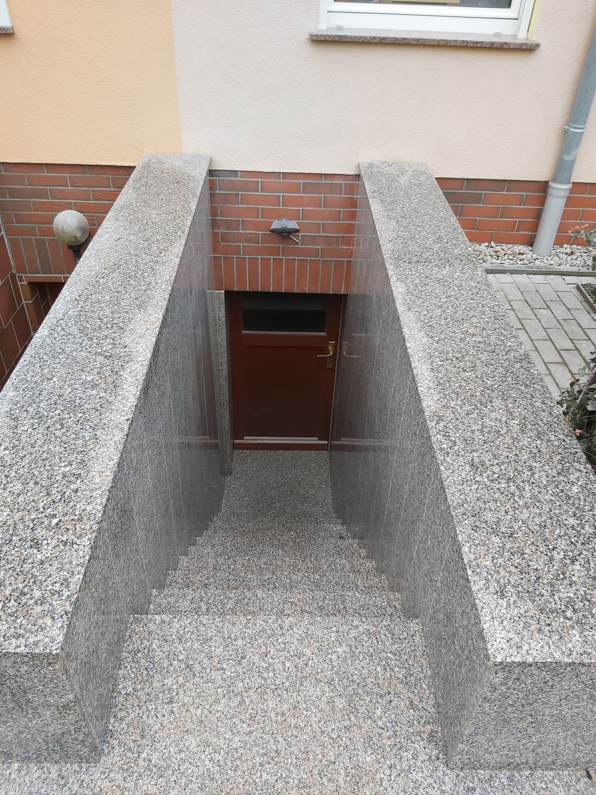 Kellertreppe in Granit Rosa Beta mit kompletter Wandverkleidung.