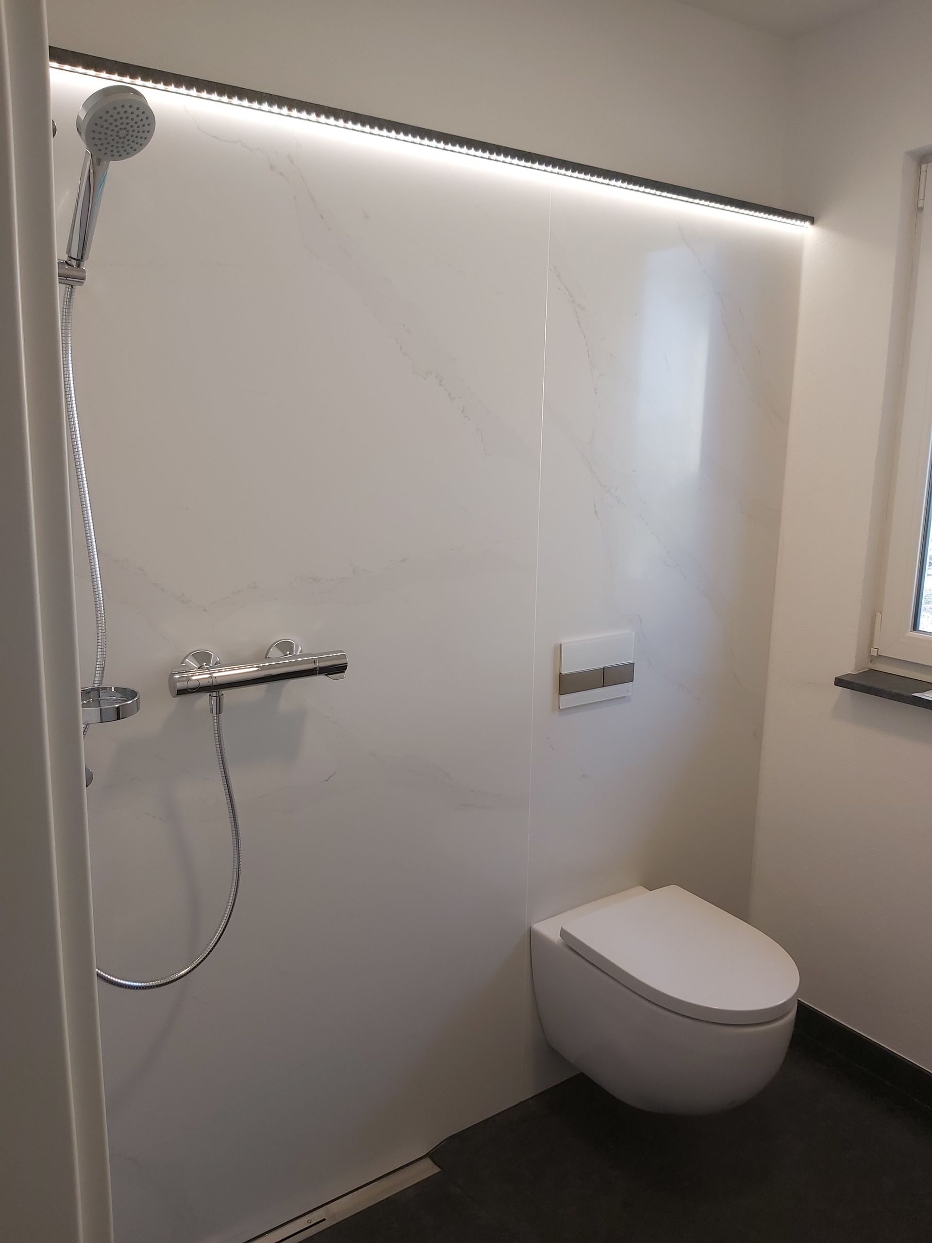 Duschrückwand aus Quartzplatten von COMPAC und Fußboden aus Granit in Steel grey mit satinierter Oberfläche.