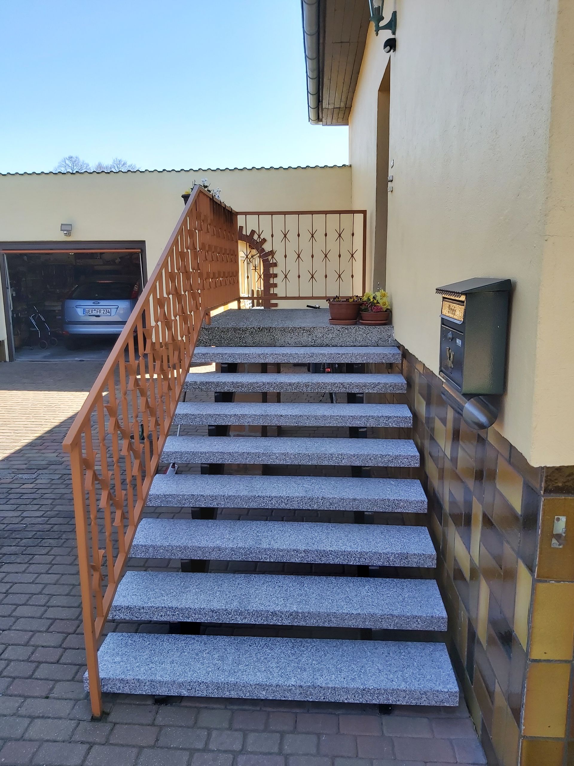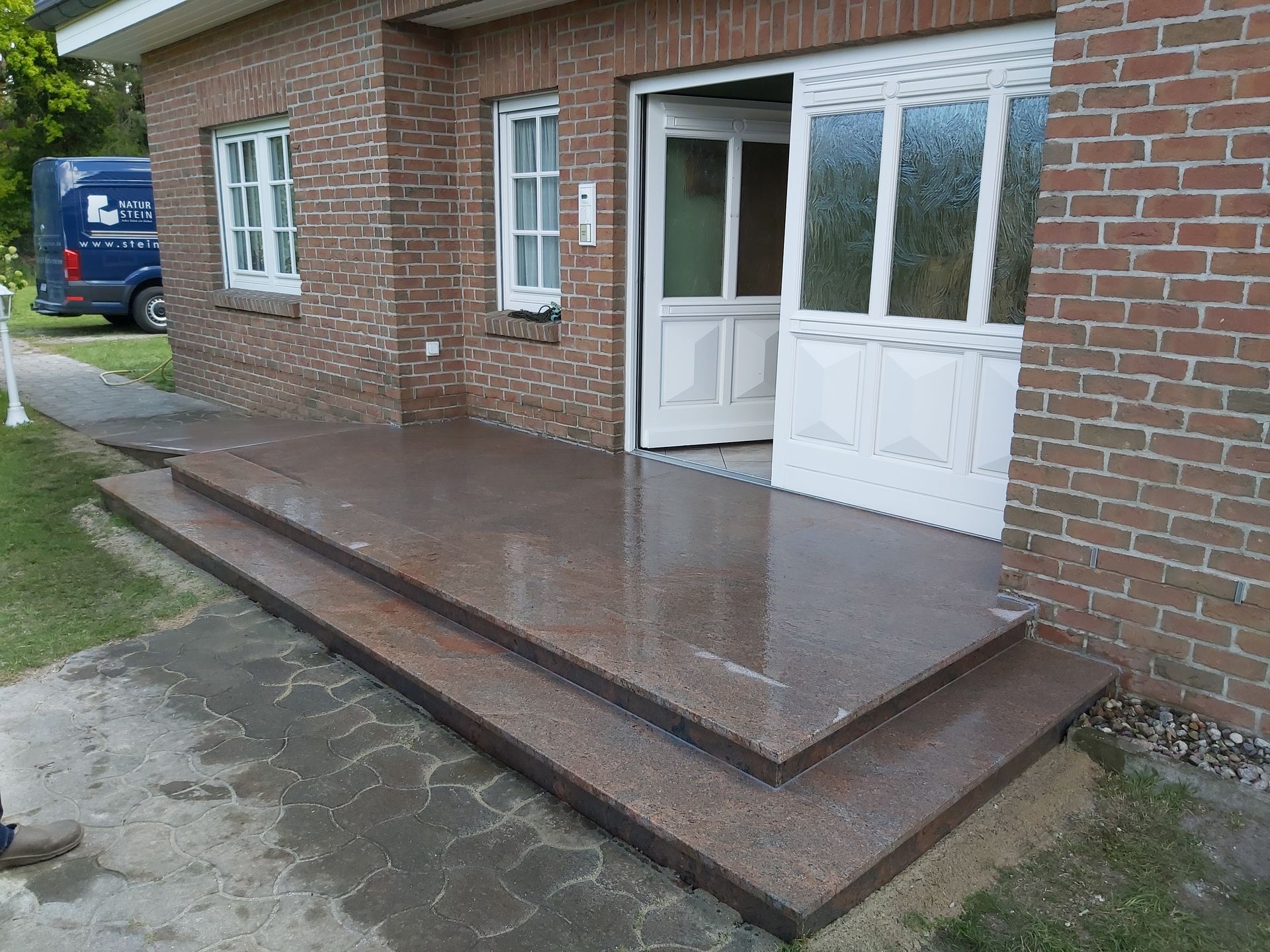 Hauseingangspodest mit Rollstuhlrampe aus Granit in Multicolor.