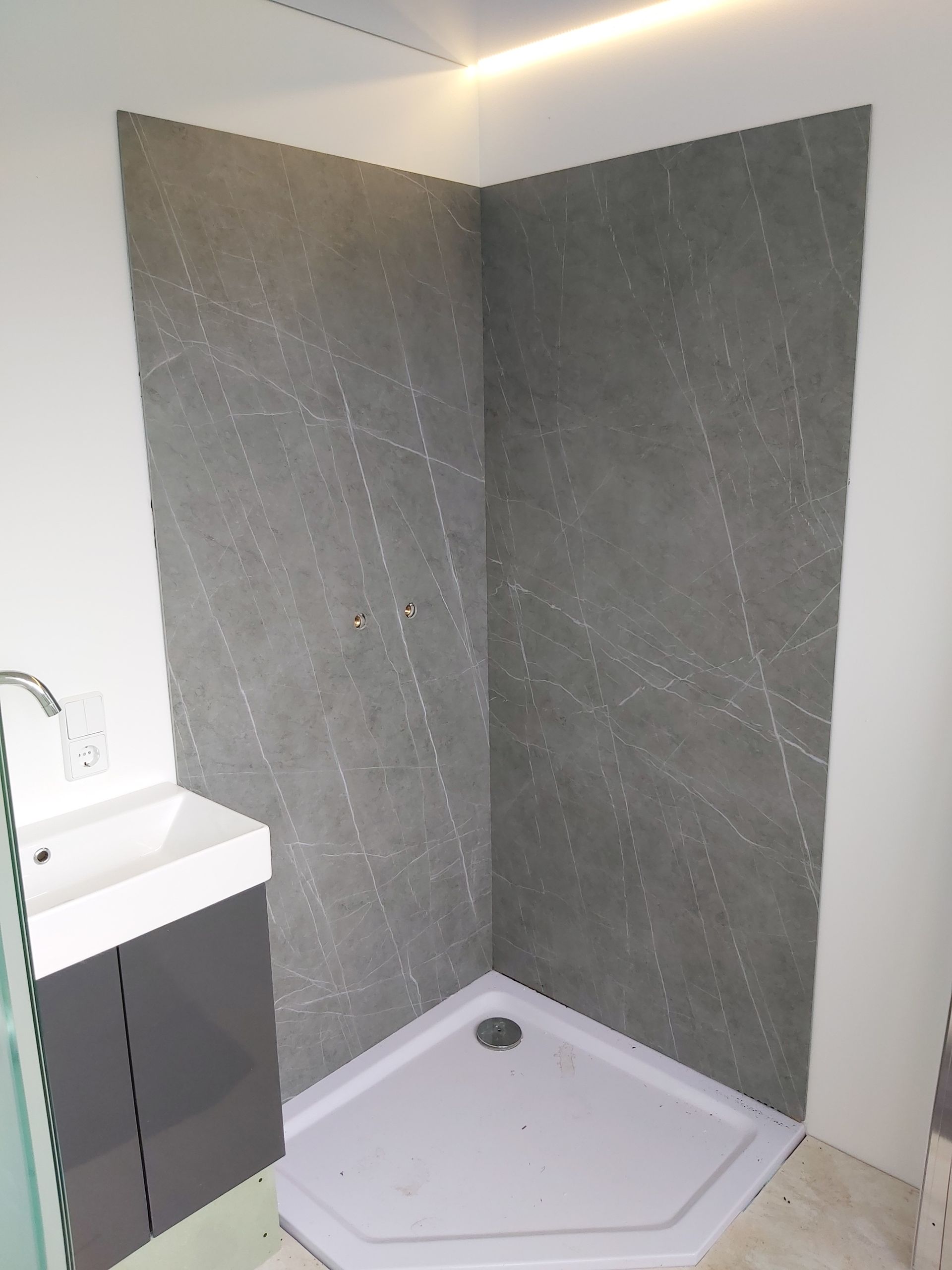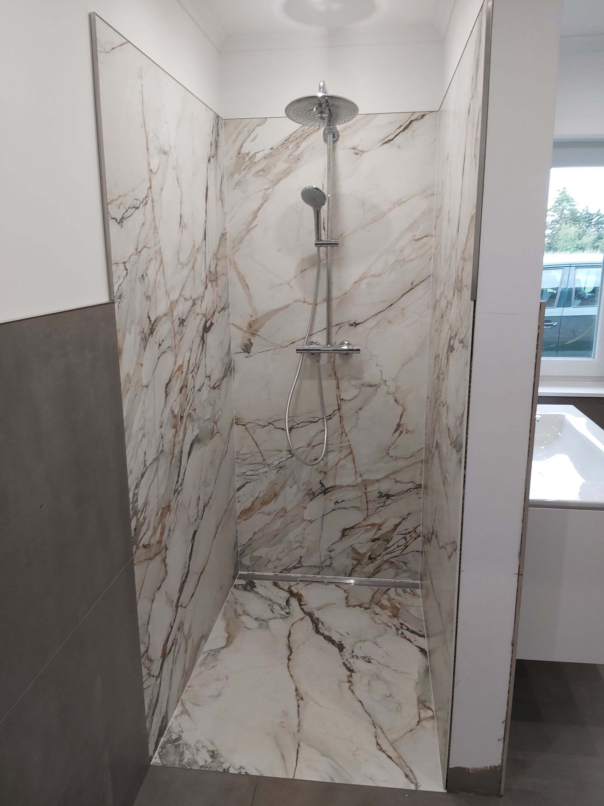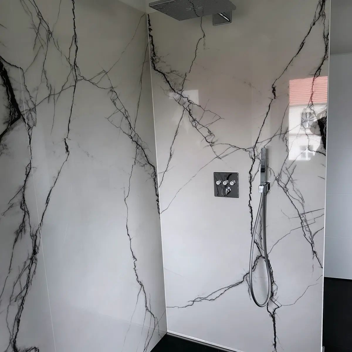 Duschrückwände aus 6mm Keramikfliese von Florim in Hochglanzoberfläche.