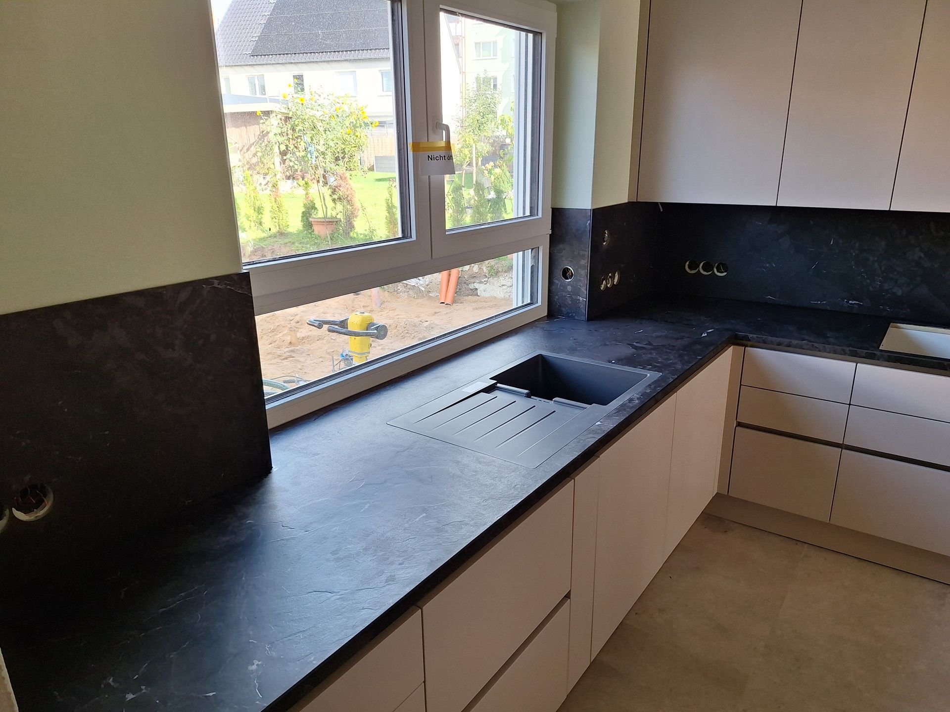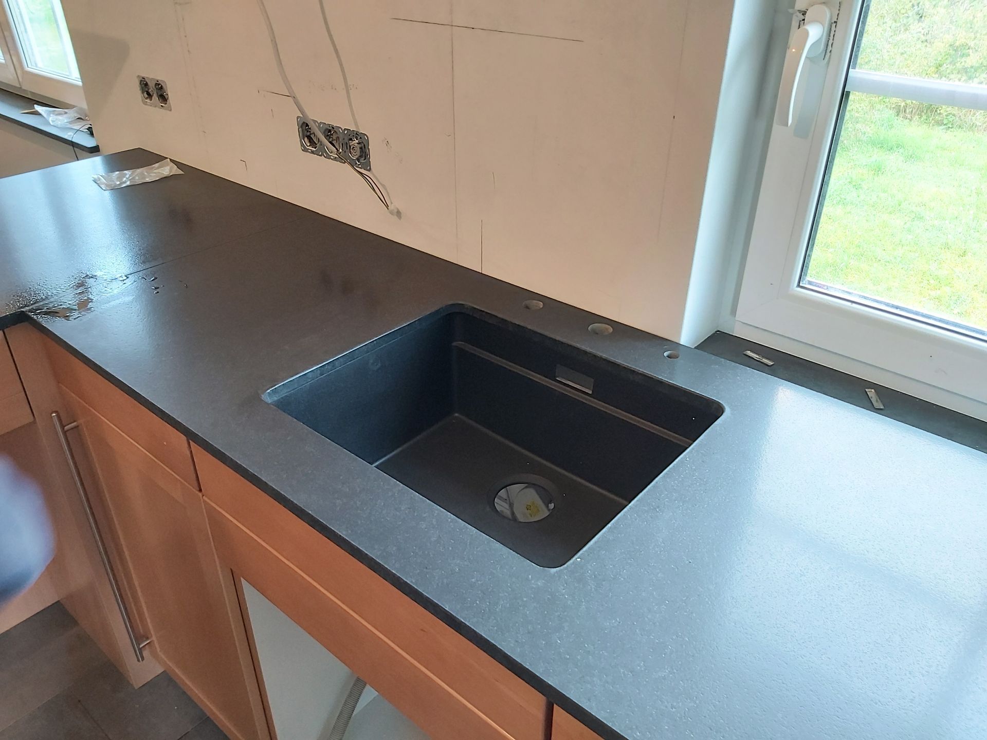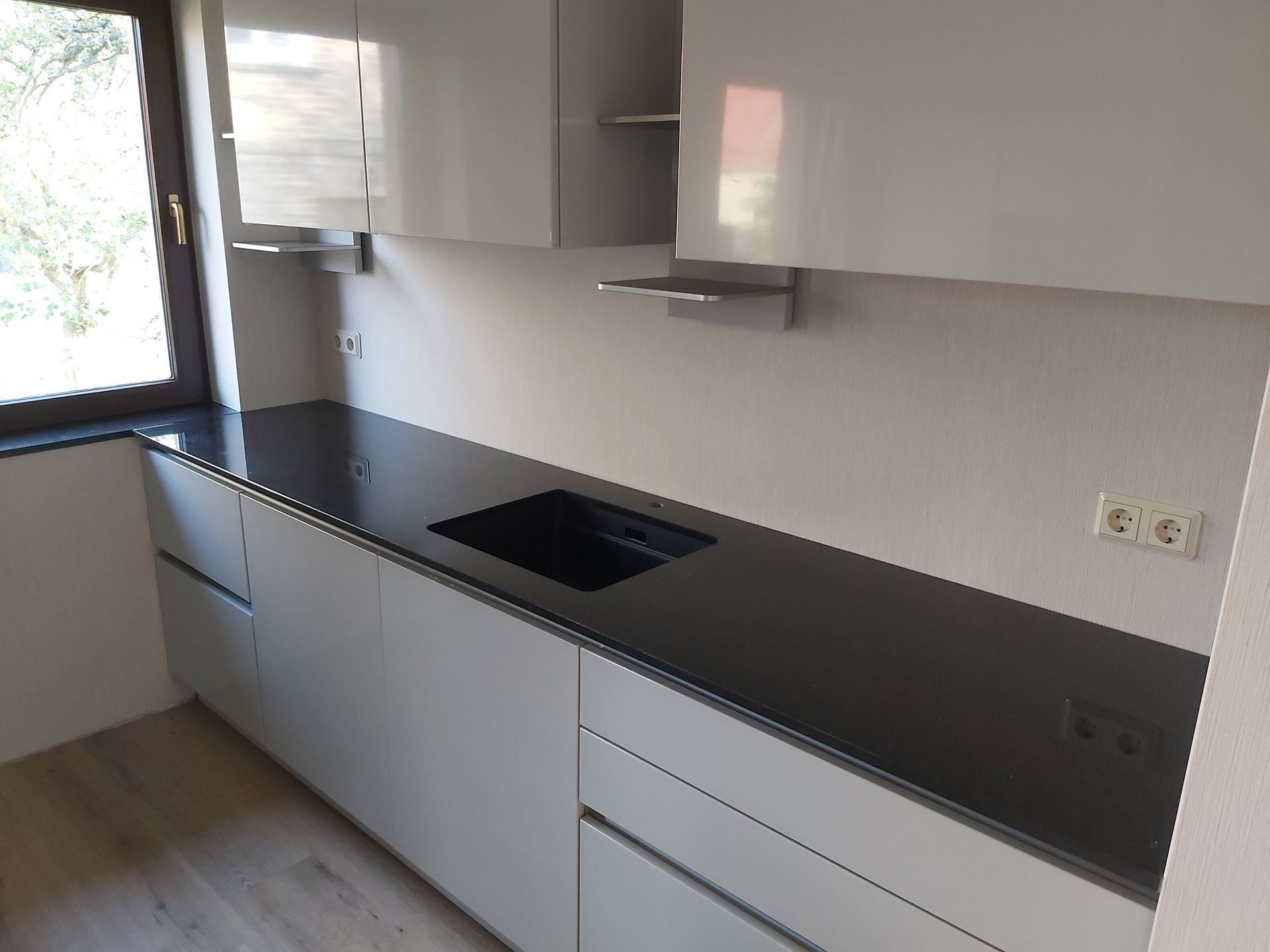 Arbeitsplatte aus Granit in Nero Assoluto in satinierter Oberfläche mit Unterbauspüle.