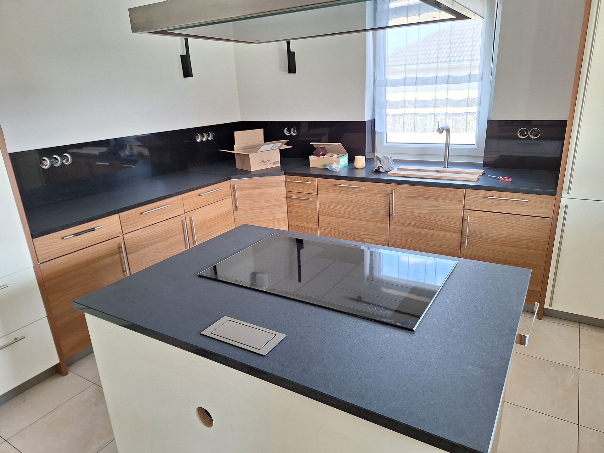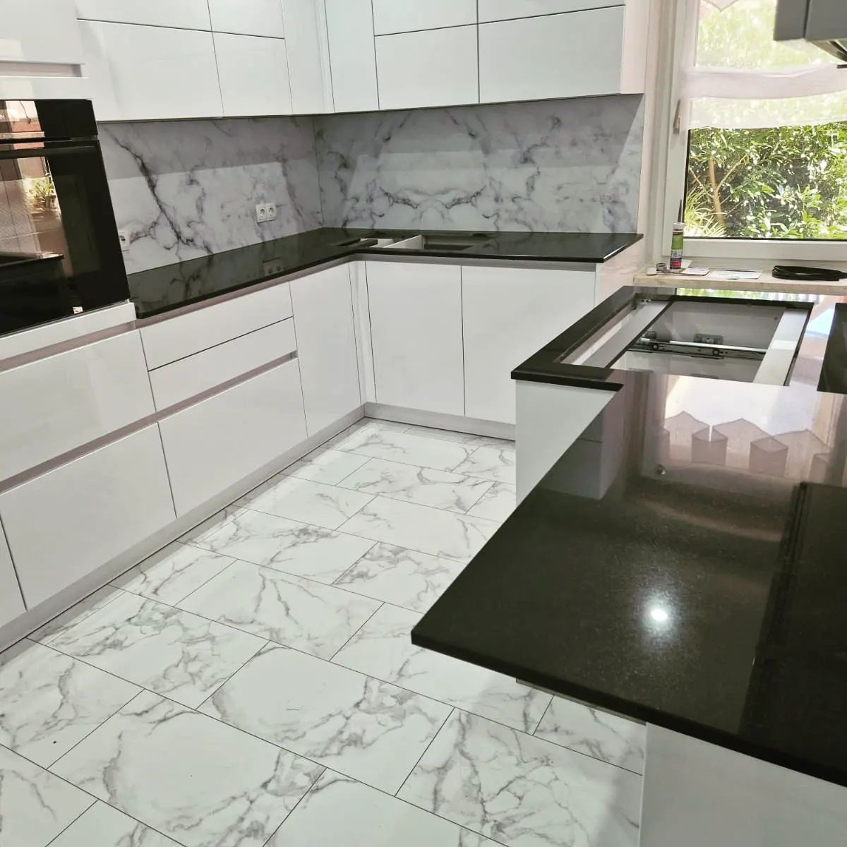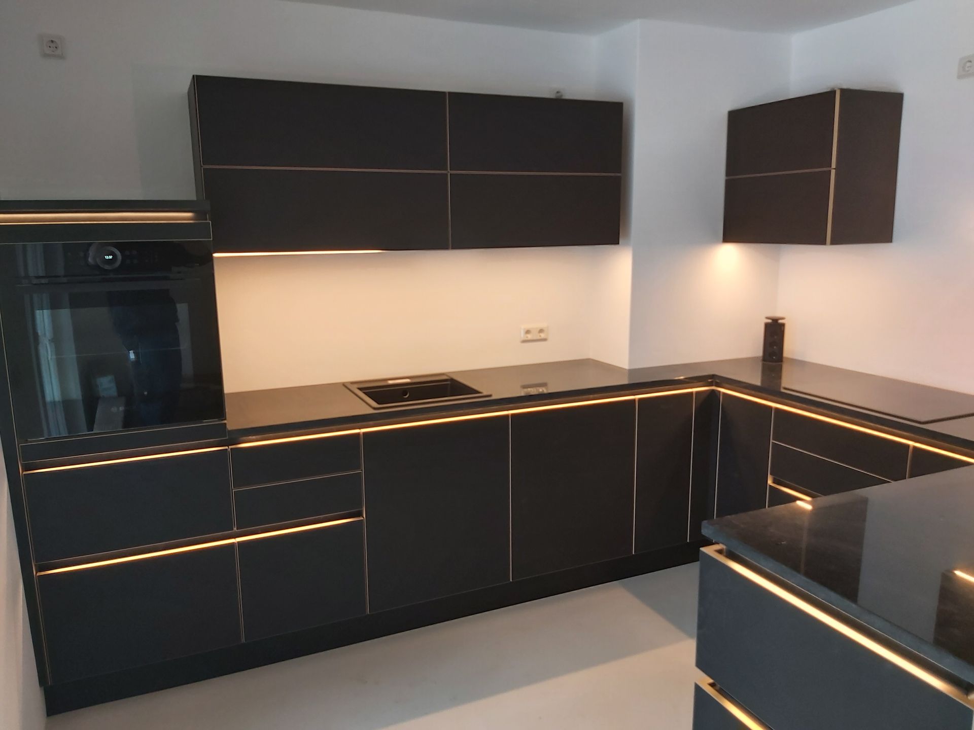 Küchenarbeitsplatten aus Granit in Nero Assoluto in satinerter Oberfläche und poliertem Spritzschutz.