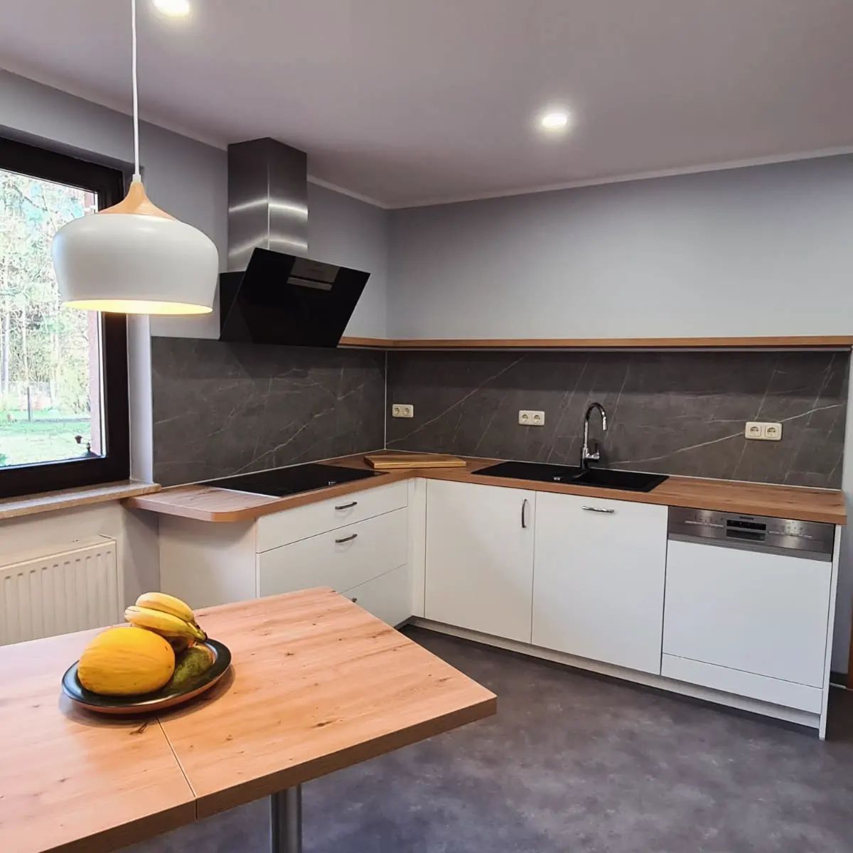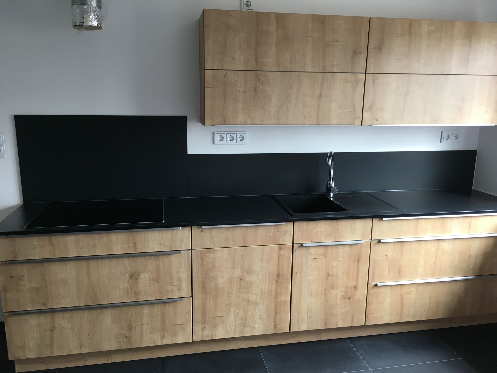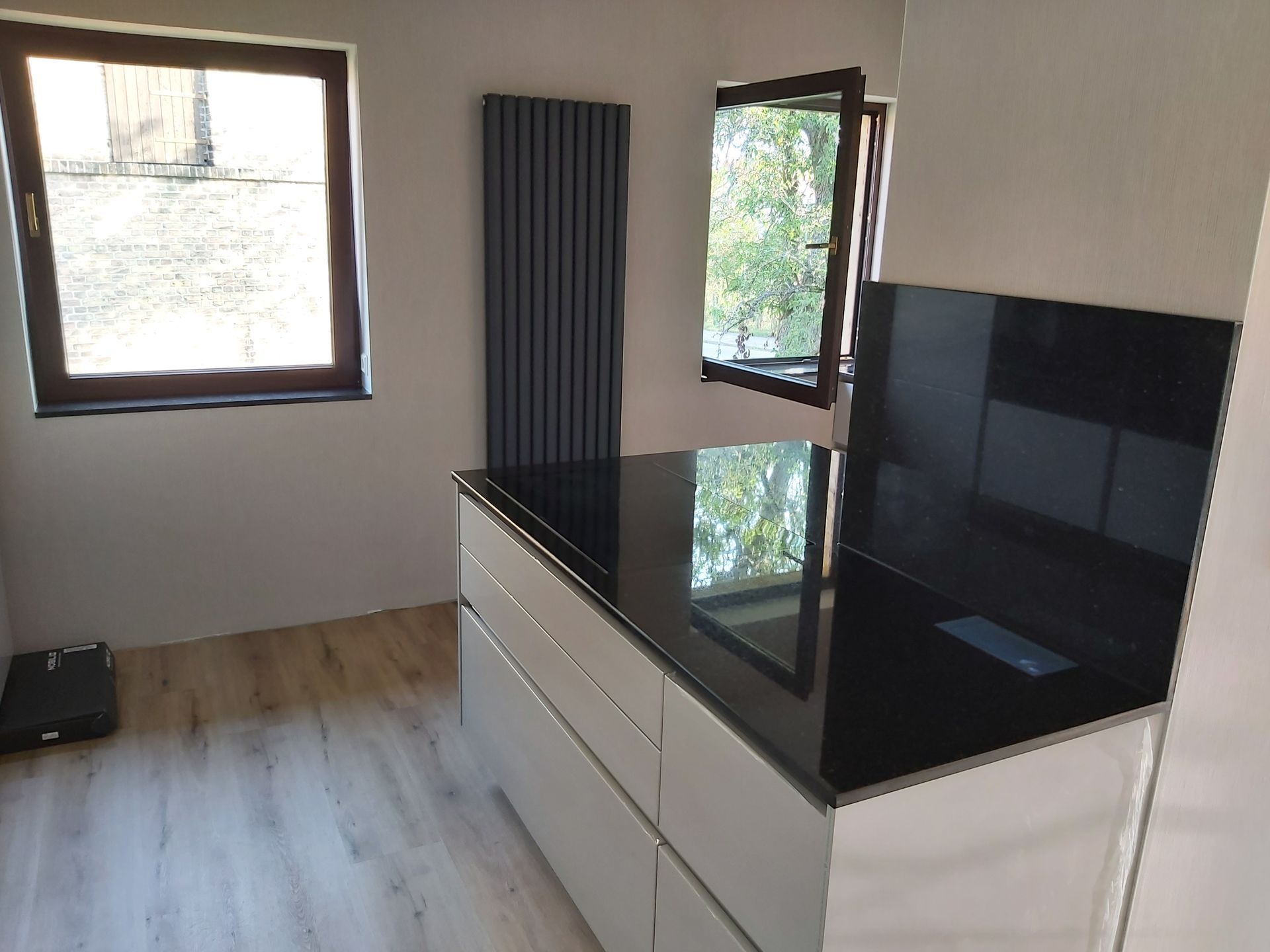 Küchenarbeitsplatten aus Granit in Nero Assoluto in satinerter Oberfläche und poliertem Spritzschutz.