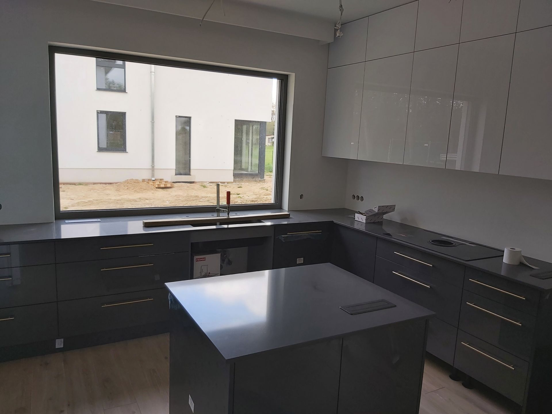 Küchenarbeitsplatte aus Quarzit in Adamantium mit Wangenverkleidung.