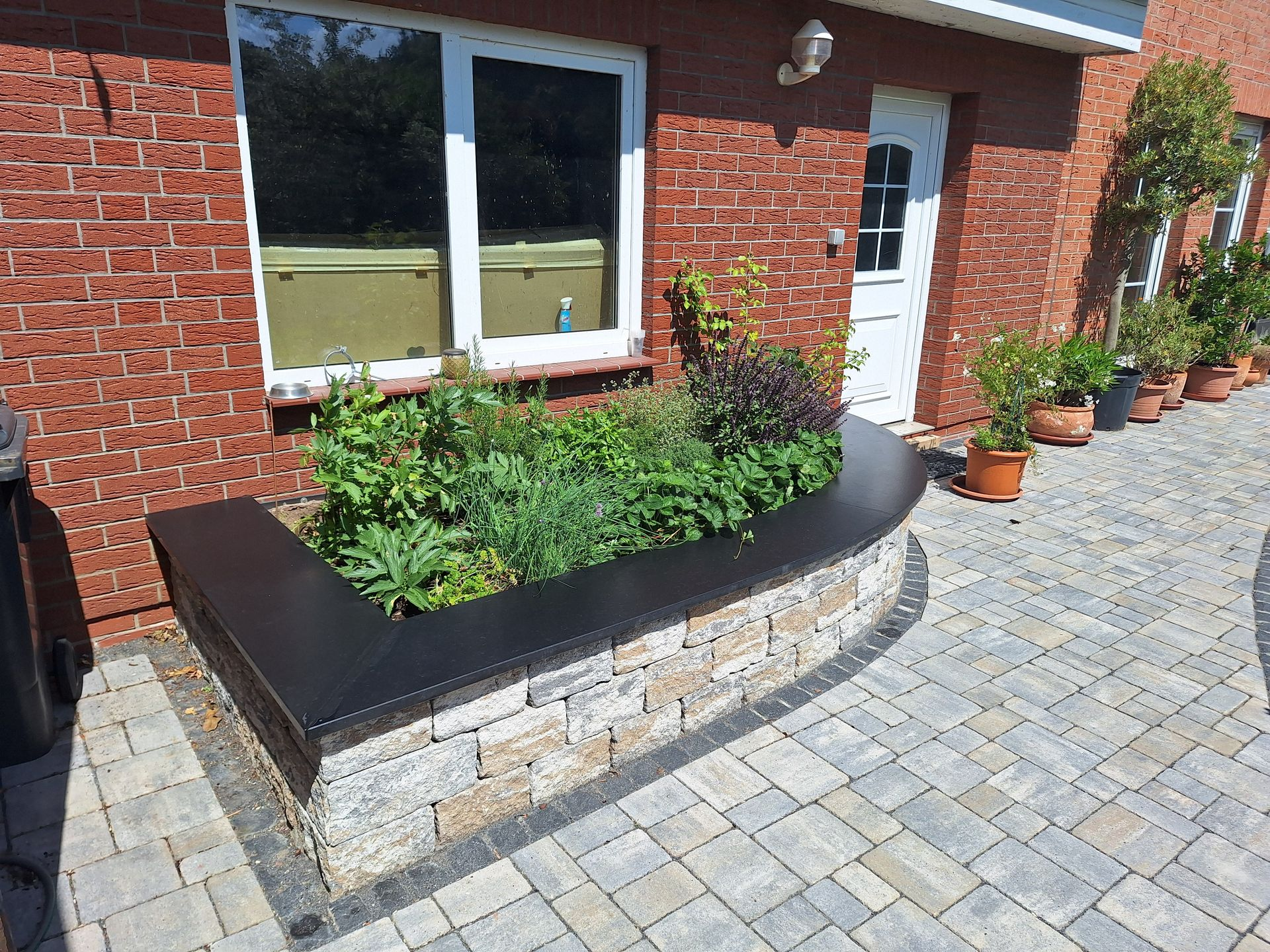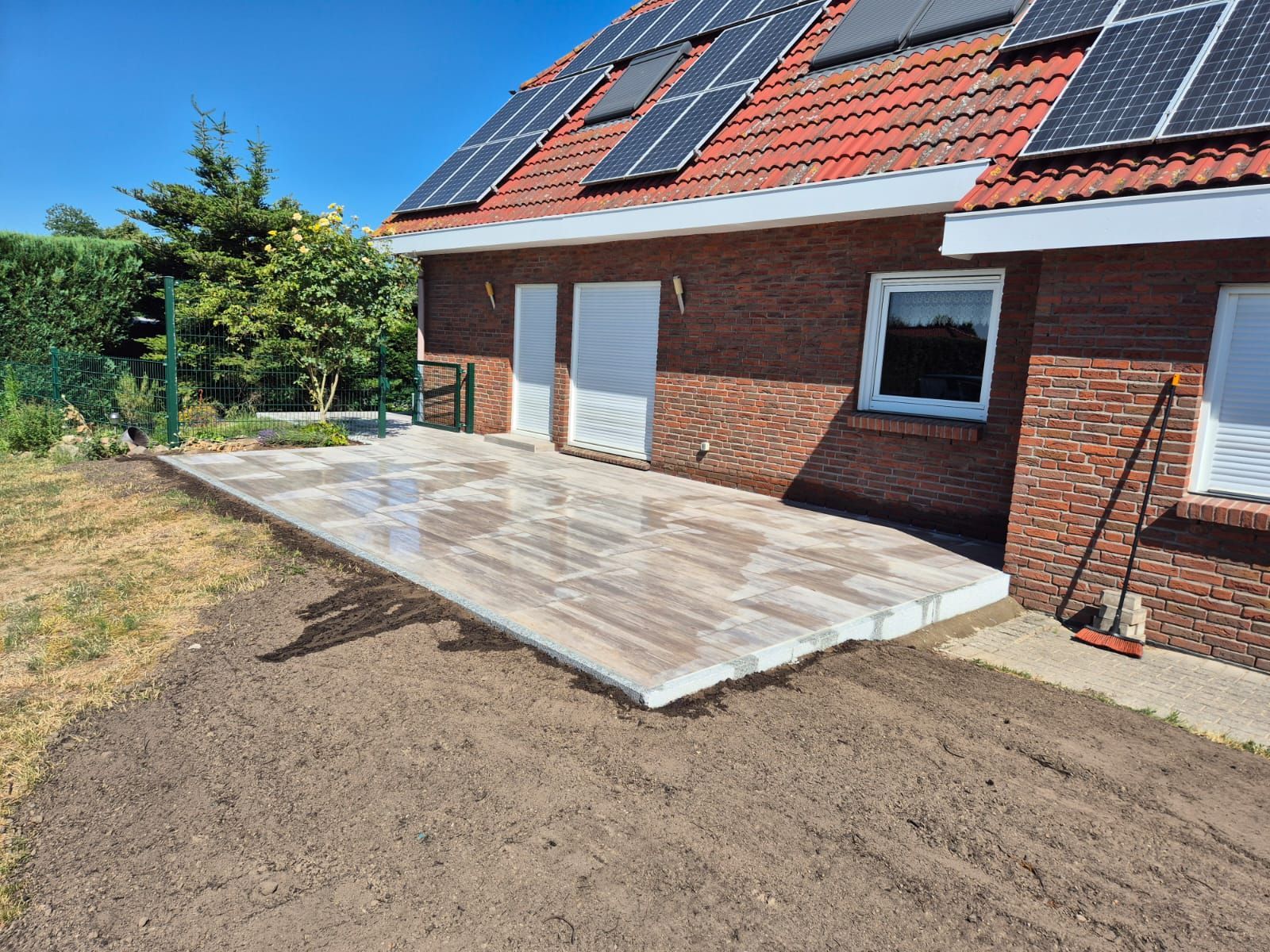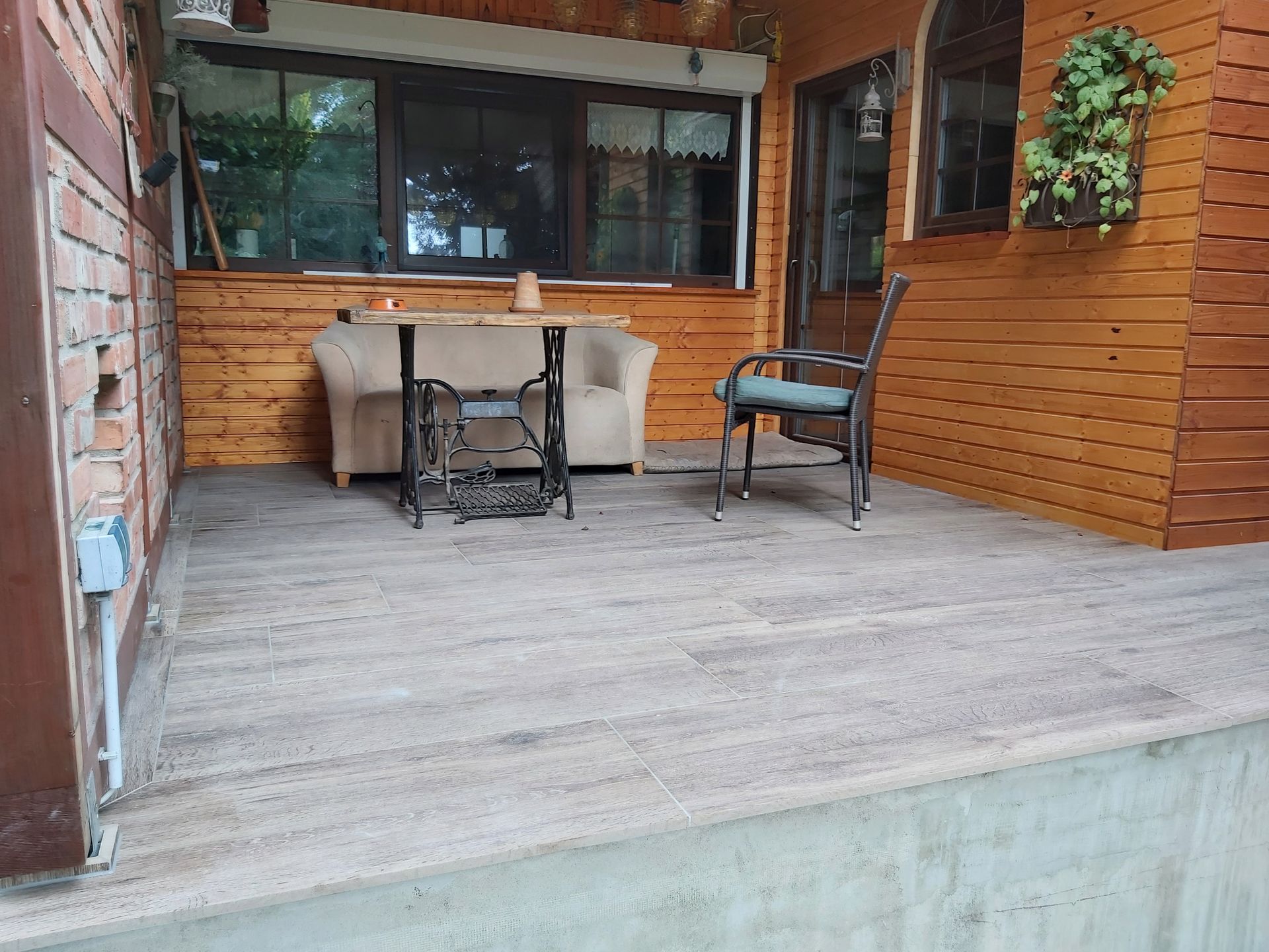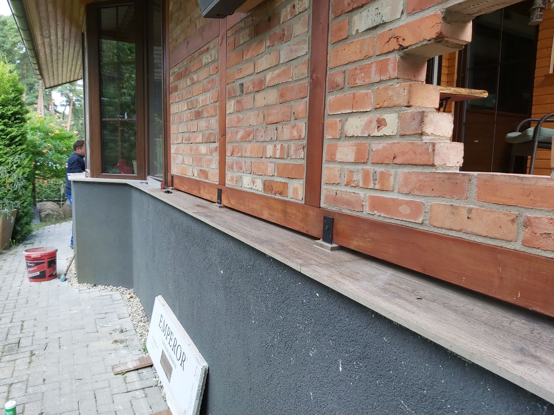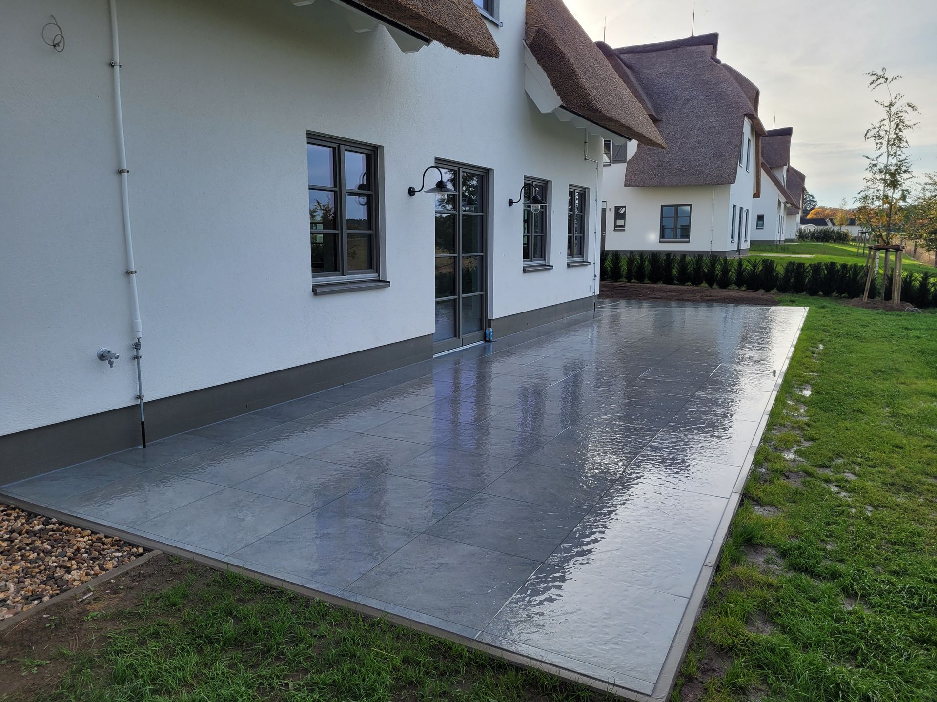 Terrassengestaltung mit Keramikplatten von Emperor mit passendem Haussockel.