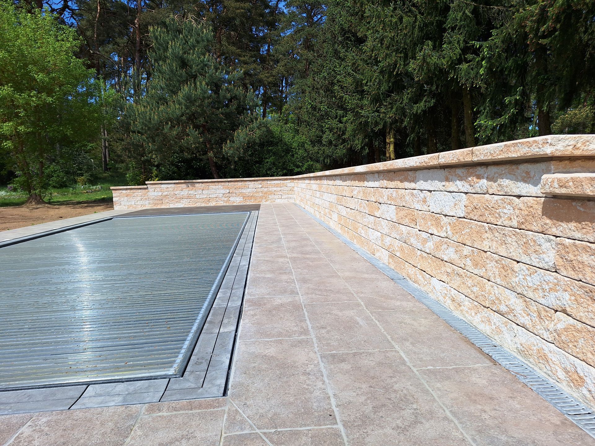 Poolterrasse mit Keramik von Emperor und Sichtschutzwand von KANN.